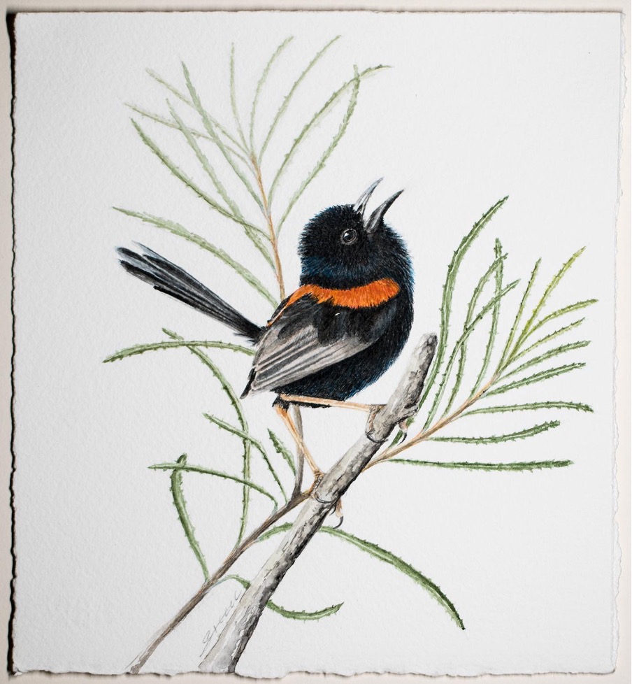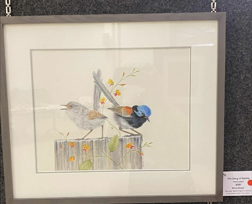 Erica had been drawing and painting most of her life, attending various art classes (including classes taught by our own Sandra Temple). She developed a passion for painting birds, especially after the bush next door to her was bulldozed and all the little birds disappeared.